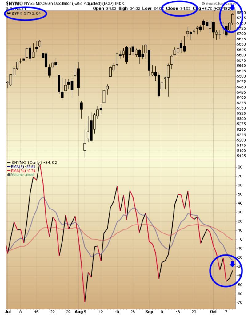 On Wednesday, October 9th, the SPX closed at a record high, yet the McClellan Oscillator, an excellent measure of momentum, registered one of the most negative readings ever at an all-time high, based on a century of data.