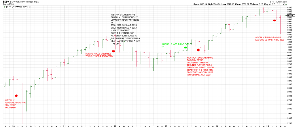 Now once again in 2025, at the start of the year, the SPX has carved out 2 consecutive lower monthly lows while the 3 Month Chart is pointing up producing a Monthly Plus 1/Minus 2 buy SETUP.