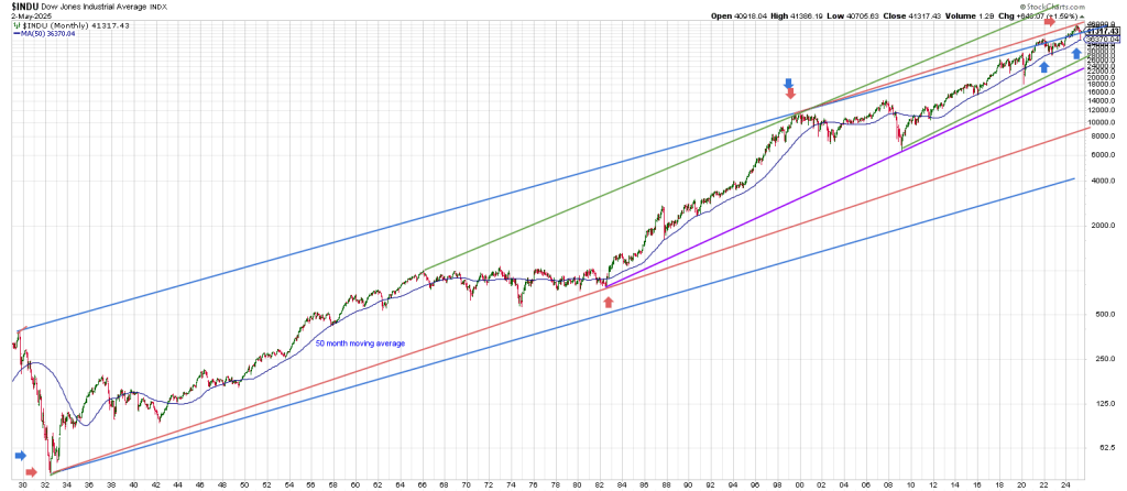 Below is a monthly DJIA from 1929 with a series of trend channels.