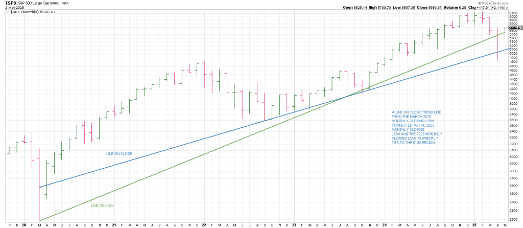 An SPX trend line connecting the March 2020 low and the October 2022 low and the October 2023 low was tested at the April 2025 low.