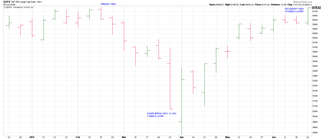 In 2000 the SPX struck a Primary High in March followed by a sharp decline and then produced a Secondary High in late August, 23 weeks later—essentially at the same price as the March peak.