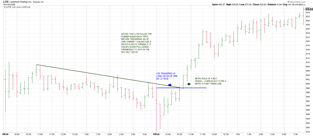 Notice that LITE pulled the rubber band back first before triggering an up ORB thereby coining for a decisive move after turning its dailies down following Wednesday’s Jack in the Box buy setup.