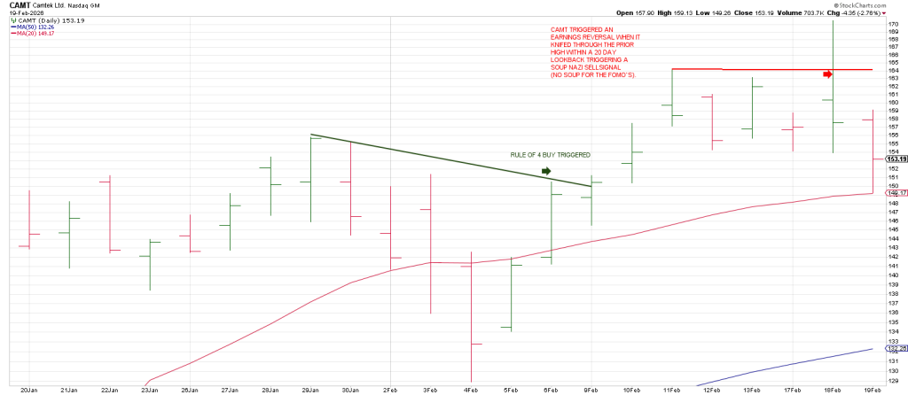 CAMT triggered an Earnings Reversal when it knifed through the prior high with a 20 day lookback triggering a Soup Nazi sell signal (no soup for the FOMO crowd).