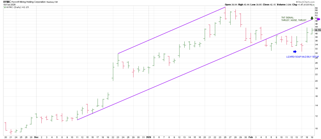 As well HYMC left a Soup Nazi buy signal on Tuesday as it undercut the low within a 20 day lookback but with at least a 4 day interval between lows).