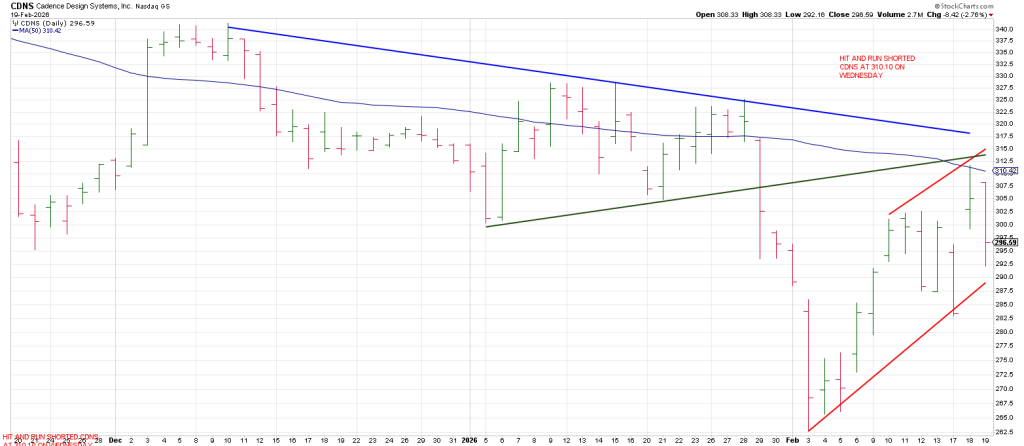 Hit and Run shorted CDNS (below) at 310.10 on Wednesday after it rallied to backtest its declining 50 day moving average in league with testing the top of a trend channel (red)