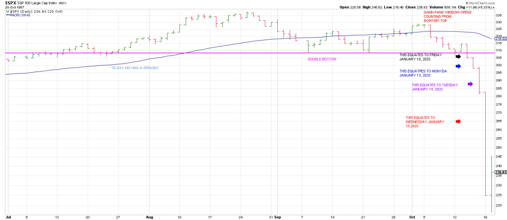 The top day in 1987 was August 25th. The Gann Panic Window opened 49 calendar days from there around September 4th where the SPX failed to reclaim its 50 day moving average.