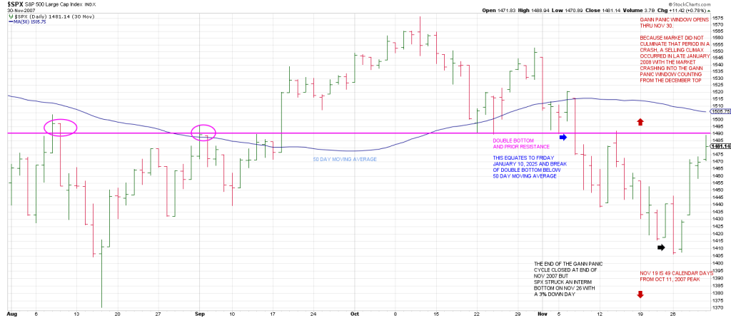 In 2007 the Gann Panic Window opened on November 19th (counting from the Oct 11 peak) and ran until November 30th.