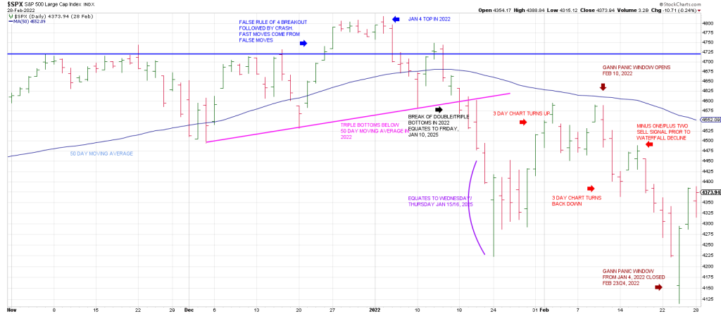 The SPX collapsed from a Minus One/Plus Two sell setup (the 3 Day Chart was pointing back down followed by 2 consecutive higher daily highs (+2)…precisely where the Gann Panic Window opens—49 calendar days from the Jan 4 peak.