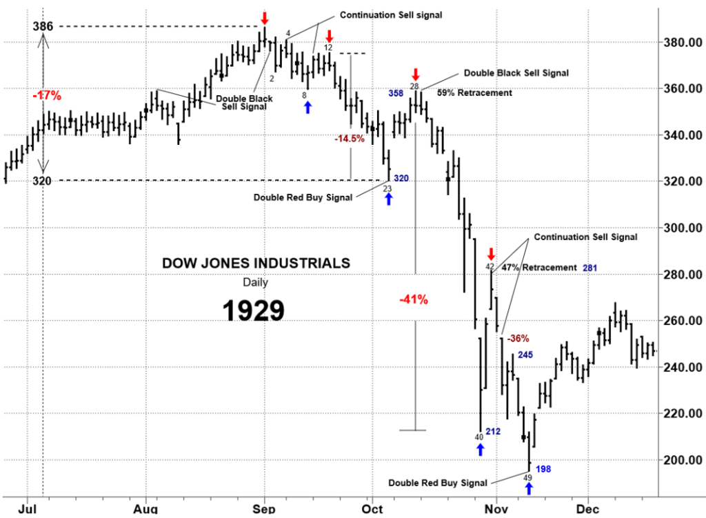 In sum, Friday’s break of the double bottom below the 50 DMA in conjunction with this week’s Gann Panic Cycle warrants caution…just as it did in two severe downturns 1987 and 1929.