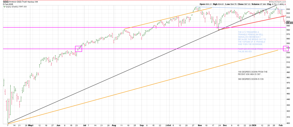 90 geometrical days/degrees later the Q’s broke-out of a SEVEN week trading range, kissing/backtesting a trend line or what I call a Ghost Line from the April 2025 low and rolled over leaving a Gilligan sell signal (a gap to a new 60 day high with a close at/near session lows).