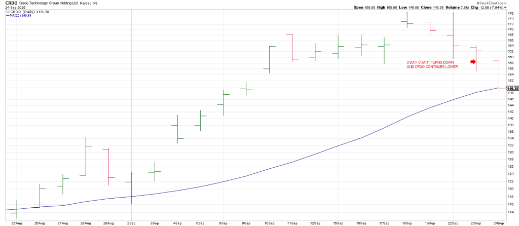 A lower low (not necessarily a lower CLOSE) will turn the 3 Day Chart down.