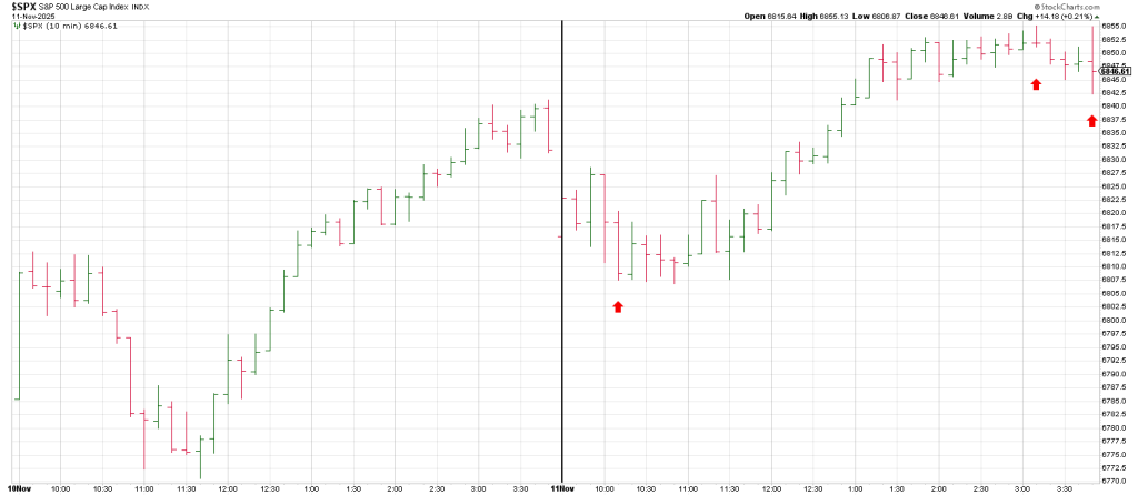 An early dip into 10:00 produces a rally into 11:00 where a deeper pullback plays out into 11:30 followed by a stronger rally than the early rally.