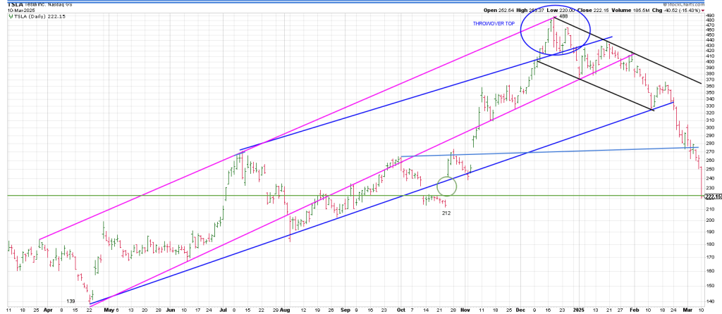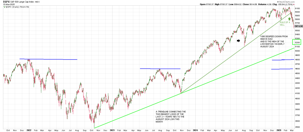 Checking the above daily SPX also shows that the accelerated decline starting in late Feb was triggered by an Angular Rule of 4 Sell…a break of an rising 3 point trend line from the October 2023 low.