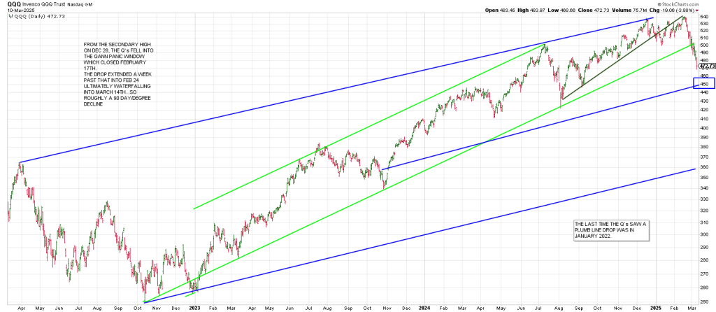 A daily QQQ from the October 2022 bottom shows a mid-channel line at 450 ish.
