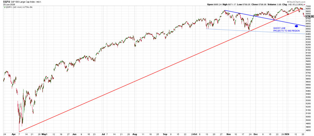 A daily SPX shows the massive Breakaway Gap that snapped a Bottoms Line from the November 21 swing low in league with a close below the 50 day line.