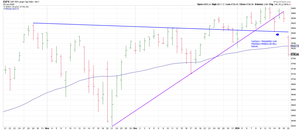 As well the SPX triggered our Triangle Pendulum sell signal: it broke out of a long triangle to the topside and reversed taking out the bottom of the triangle with authority yesterday.