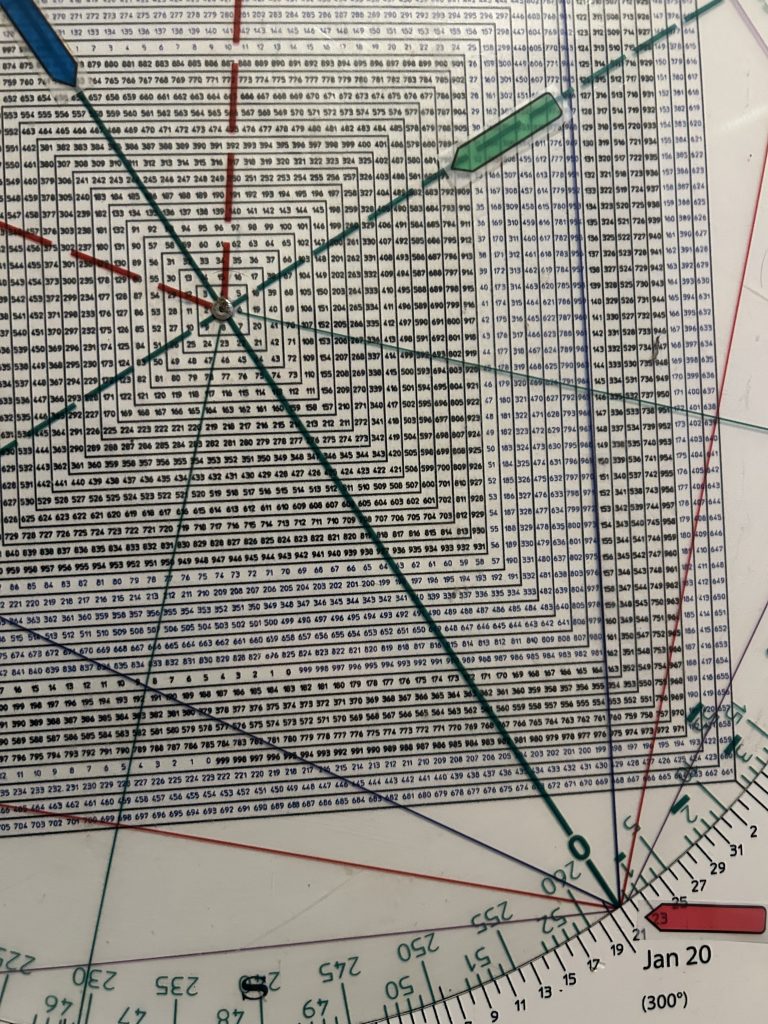 180 degrees straight across and opposite January 21st is 656 (6560 blue).