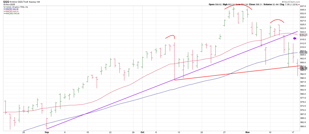 As long as the QQQ remains below its 50 day line and especially 599, pressure remains down.