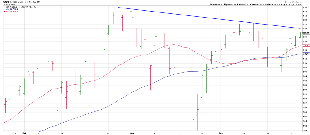 Markets produced a divergence on Wednesday with the SPX striking a record high with the QQQ still below a Tops Line connecting the October 29 high and the December 5 high.