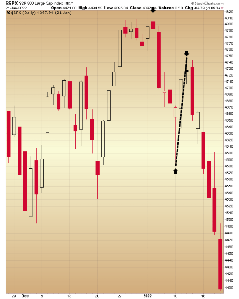 Second, if we study the charts from 1990, 2007, 2020 and 2022, we observe that after the initial thrust, the SPX consistently produced a counter trend move last 2 to 6 days (this was also true in the crash of 1929).