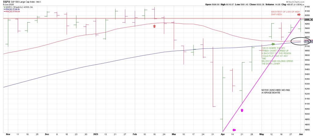 A 200 point SPX correction simply takes it back to the region of the big Phil D Gap from May 12 where there happens to be a weekly 20/50 moving average Bowtie.