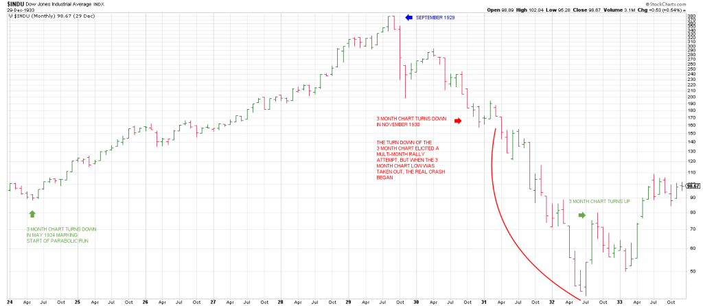 The 3 Month Chart nearly turned down in November 1929, the closing low of the Great Crash.