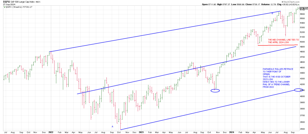 We posted the SPX weekly below in the Sept 30 report showing a mid-channel line congruent roughly with the April 2024 low and the January 2022 peak.