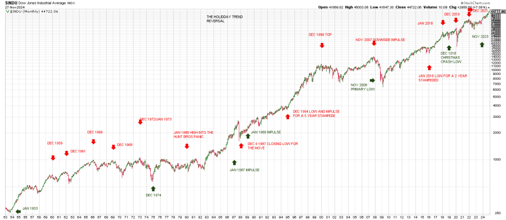 Despite the old saw of the Santa Claus rally, markets have often changed their trend, turning down, around the Thanksgiving/Christmas holidays.
