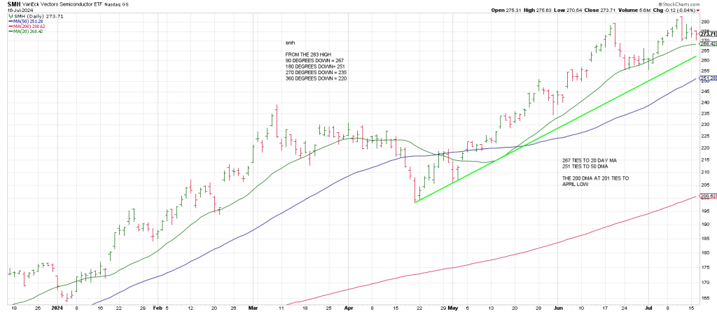90 degrees down = 267. So SMH is testing 90 degrees down this morning in tandem with its 20 day MA.