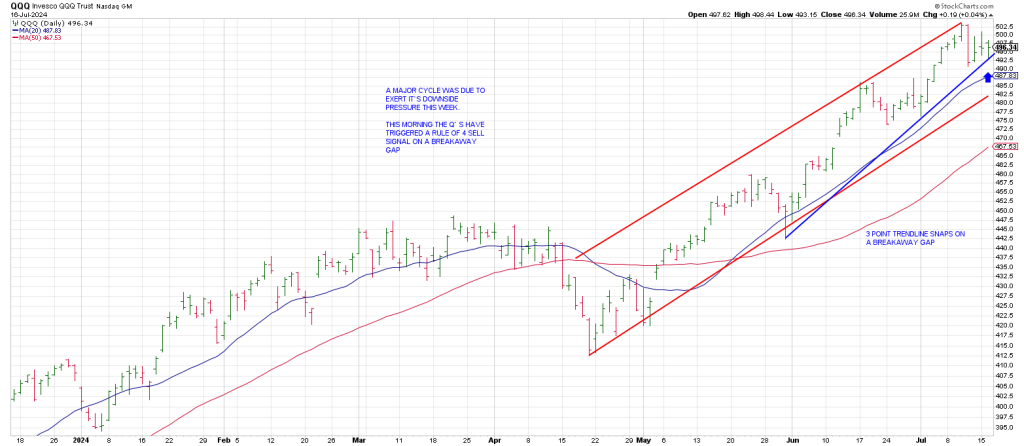 There is a strong likelihood that QQQ will be magnetized to the 481 region quickly as it is triggering a Rule of 4 Sell (a break of a 3 point trendline) on a Breakaway Gap this morning.