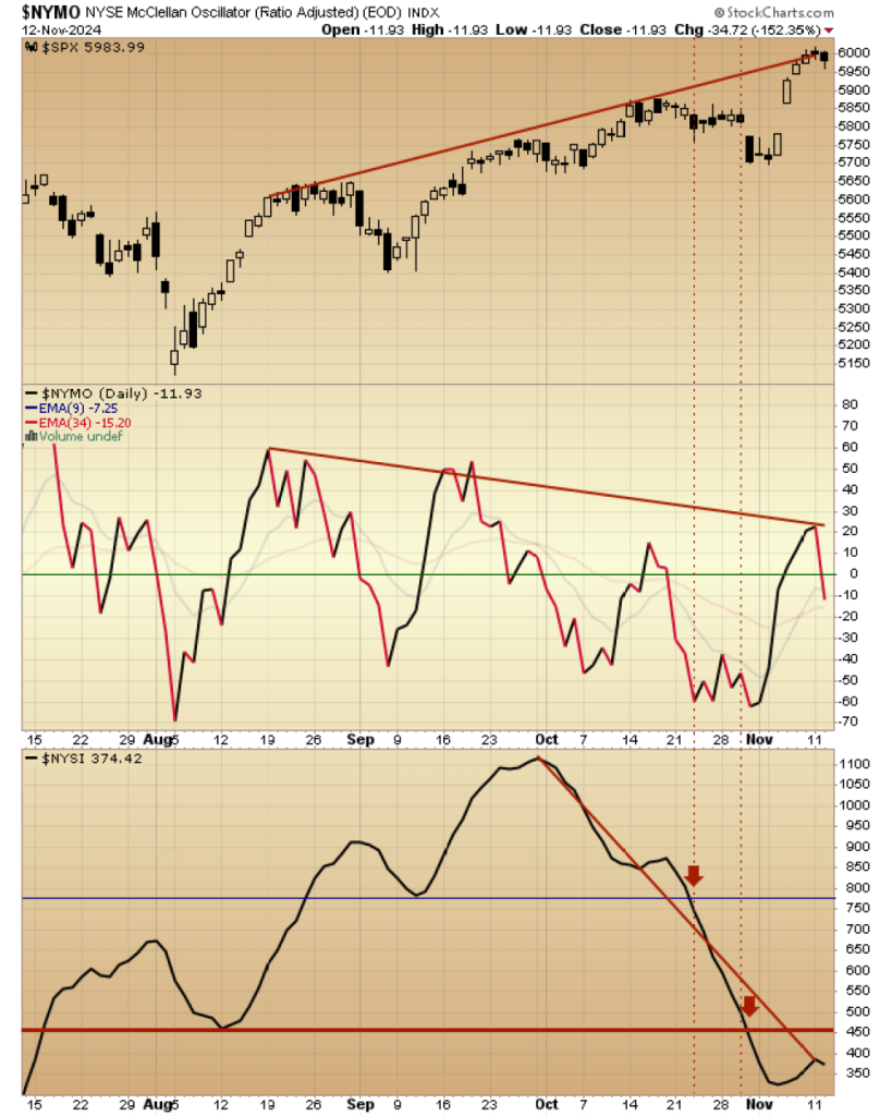 With the SPX slipping by 17 points and a resounding net declines on the NYSE, Tuesday’s market action was enough to reverse the McClellan Oscillator from its recent high of +21 back below zero in just one trading session.