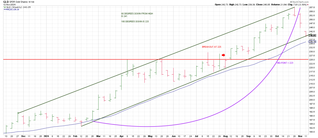 The Sq of 9 Wheel did a fantastic job of alerting us to risk in GLD at the 255 region.