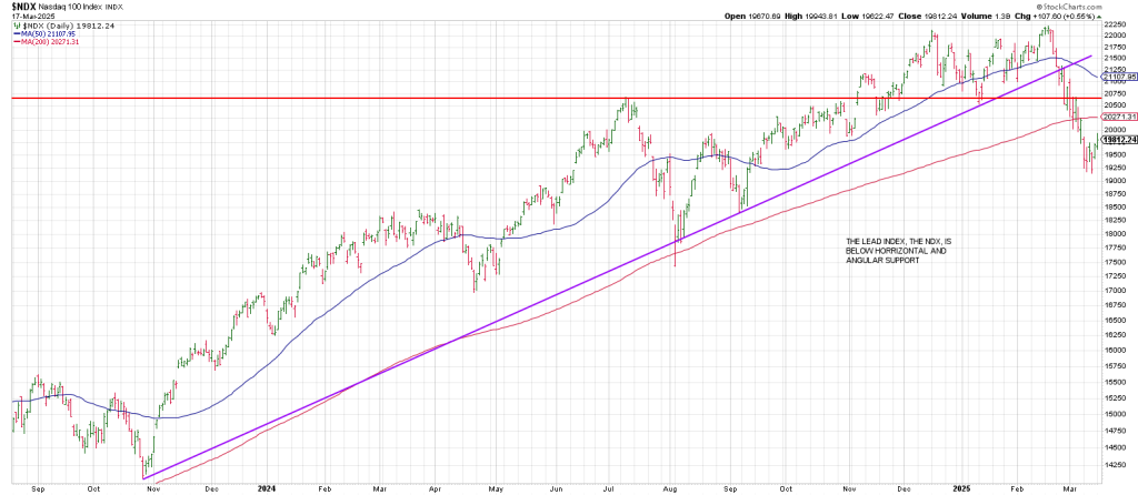 1. The lead index, the NDX is below both angular and horizontal support. It has broken a Bottoms Line from the major October 2023 low. It is below the summer highs.