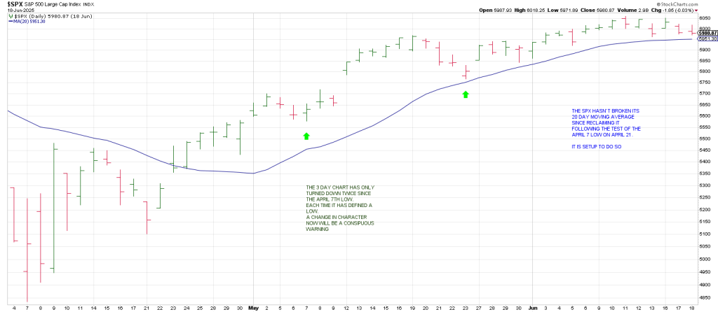 A turndown in the 3 Day Chart now that does not define a low soon in terms of time and price is sounding a siren…. particularly if the index breaks its 20 day ma and holds below it.
