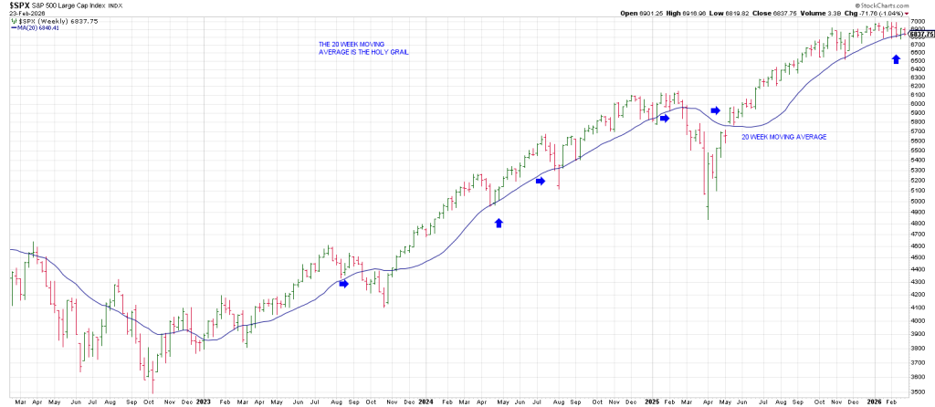 The SPX closed below its 20 week moving average on Monday—not by much—but for the first time since reclaiming it after the April 2025 low.