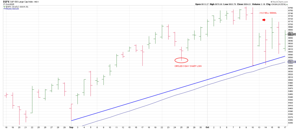 The 3 Day Chart turned back up immediately after the Sept 25 low; however the knife down on October 10 took out the CIRCLED 3 Day Chart low from Sept 25 turning the 3 Day Chart back down.