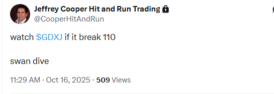 On Thursday we tweeted “watch GDXJ swan dive below 110”.
