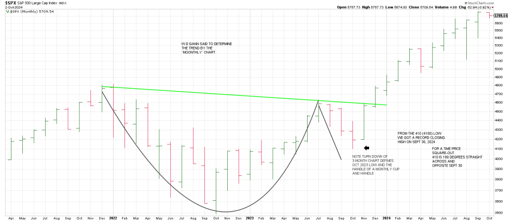 From the Oct 2023 low of 410 (4100), the SPX ran up to a record closing high on Sept 30th, 2024 perfecting a Time/Price square-out.