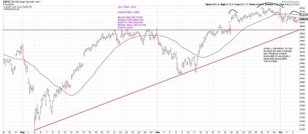 Interestingly, an hourly SPX shows that a snap back could install the right shoulder of an hourly Head & Shoulders coincident with a backtest of the 50 hour moving average