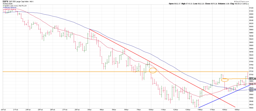 The SPX rally from the March 13 low of 5500 to Wednesday’s high of 5715 reclaimed 215 points marking a 33.1% retrace of the decline from the Feb peak.