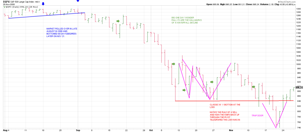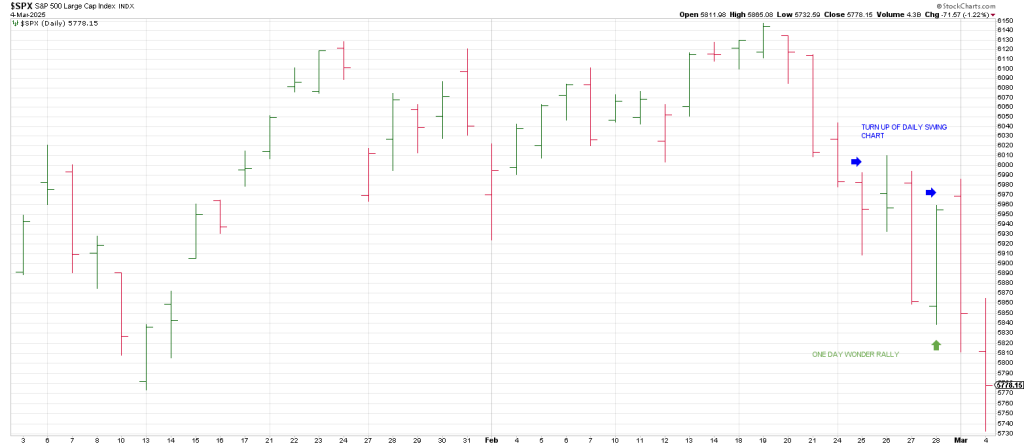 One day wonder rallies and turn ups of the Daily Swing Chart are hallmarks of waterfall declines.