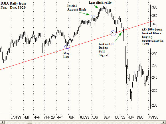 A DJIA from 1929 shows the Get Out Of Dodge sell signal produced when the DJIA broke a trend line for the year.