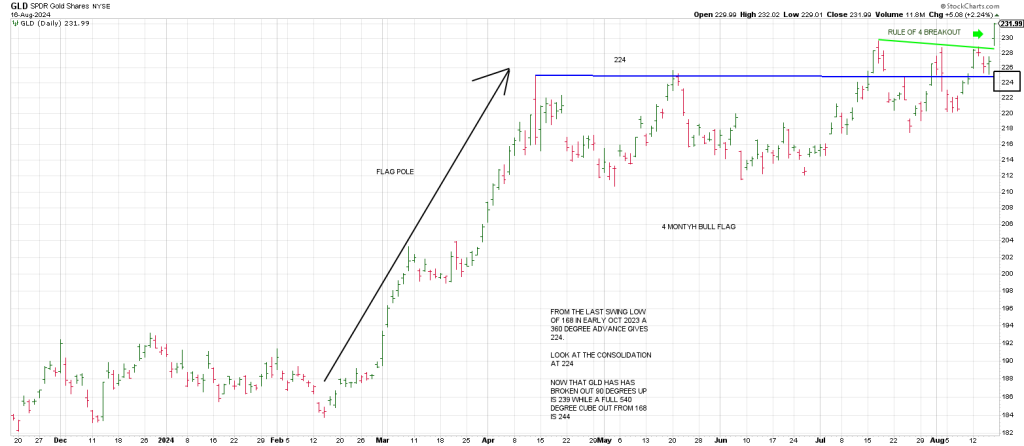GLD exploded 5 points to 232 after triggering a little Rule of 4 Breakout on a gap.