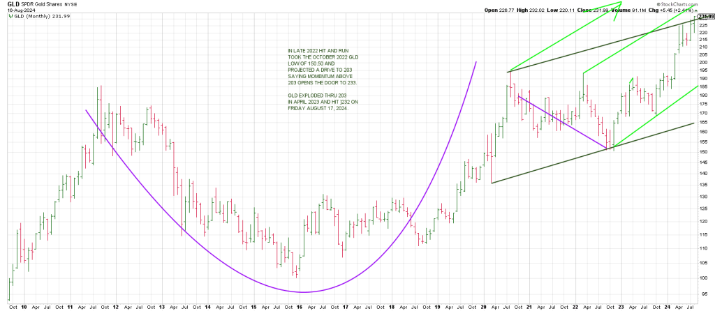 Pulling back the lens to check the monthlies we see that GLD closed above a 4 year channel on Friday (dark green channel).