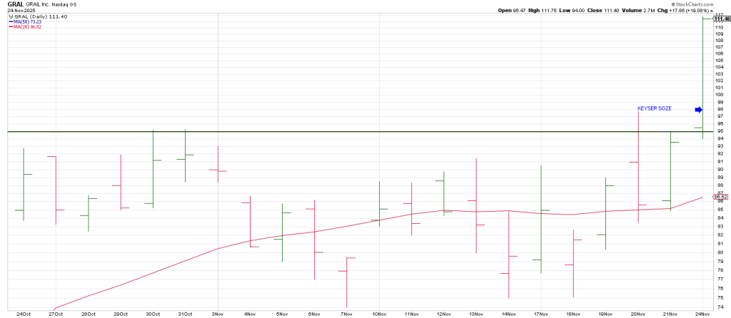 GRAL exploded from a Peekaboo New High setup after triggering a Keyer Soze reversal of a reversal taking out Thursday’s reversal high.
