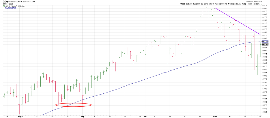 The Q’s struck a double bottom on September 2, producing the strong advance to the Oct 29 peak.